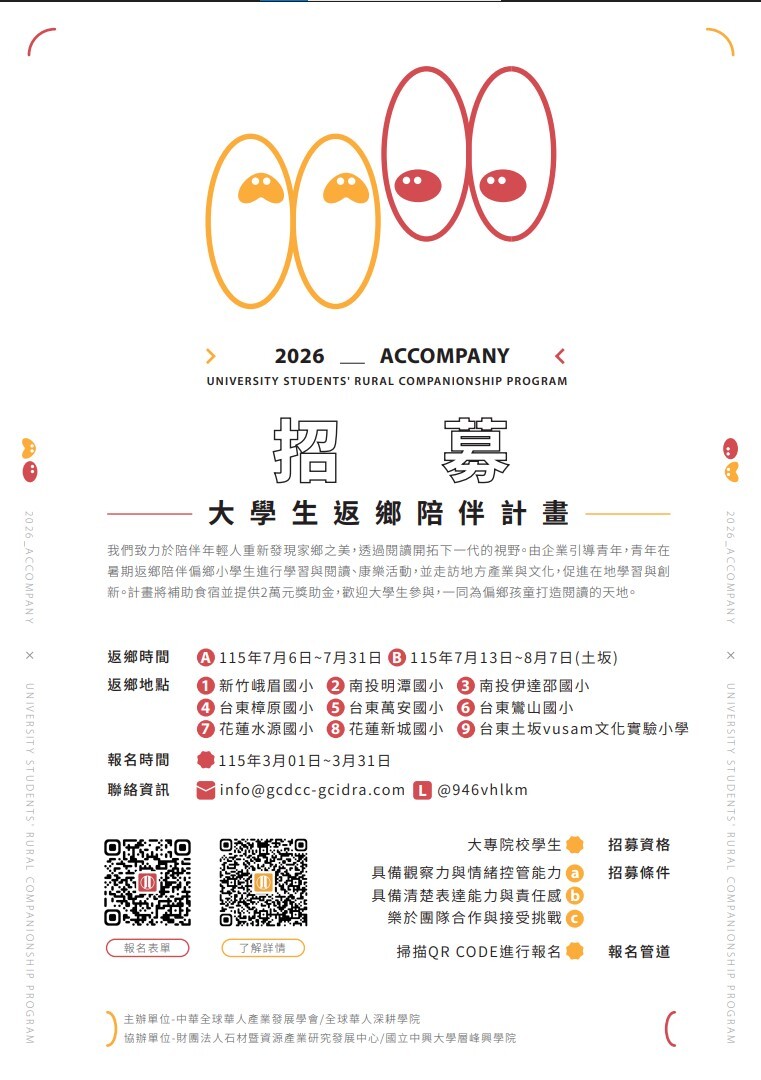 【轉知】全球華人深耕學院2026大學生返鄉陪伴計畫招募